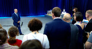 Путин проводит встречу с сотрудниками выставки, которые рассказывают о своих успехах и делятся с главой государства впечатлениями.ТАСС