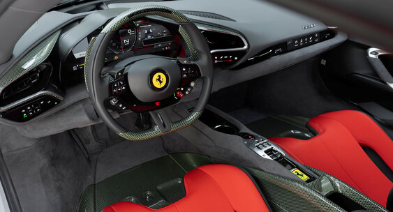 Приборная панель и органы управления выполнены в стиле современных моделей Ferrari, но с отсылками к классике.110KM