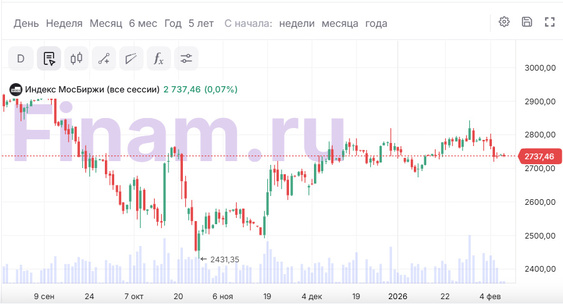 Индекс МосБиржи к вечеру воскресенья, 8 февраля, почти совсем растерял импульс к росту, прибавляя всего 0,07% - до 2737,46 пункта.Finam.Ru