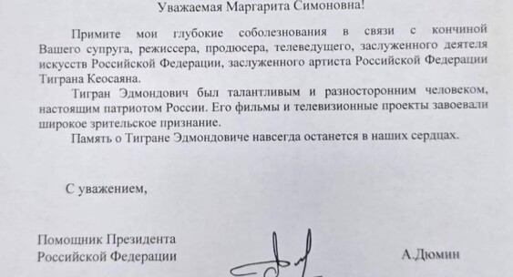 Помощник президента Дюмин выразил соболезнования вдове Тиграна Кеосаяна