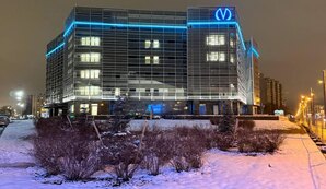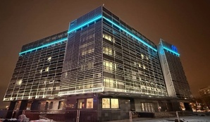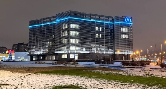 В тёмное время суток фасад подсвечивается двумя контурами: первый освещает стеклянный фасад здания снизу тёплым, белым светом; второй — по контуру здания на высоте пятого этажа бирюзовым.78.ru