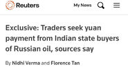 Санкции Запада, введенные против России в 2022 году, ускорили использование Индией во внешней торговле альтернативных валют, включая китайский юань и дирхам ОАЭ, для расчетов по нефтяным сделкам, в которых до сих пор доминировал доллар США, отметил Reuters.ТАСС