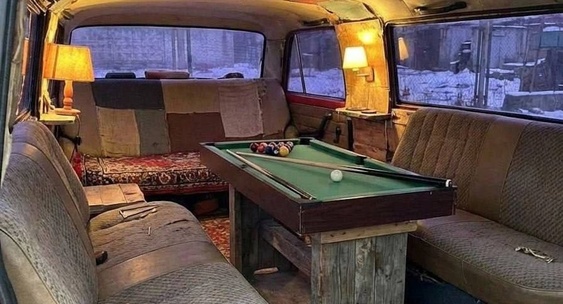 Внутри салона, помимо штатных сидений, появились диваны, снятые с других «Жигулей», а центральное место занял стол с мини-бильярдной доской.110KM