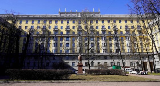 Этот жилой дом, построенный в 1934 году по проекту Льва Ильина и Анатолия Арнольда для рабочих текстильной фабрики, является ярким образцом сталинского неоклассицизма и ключевым элементом архитектурного ансамбля Московского проспекта.