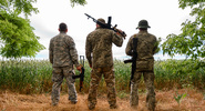 На кадрах видно, что в ходе стрелкового боя группа наемников пытается вырваться из засады.RiaStrela