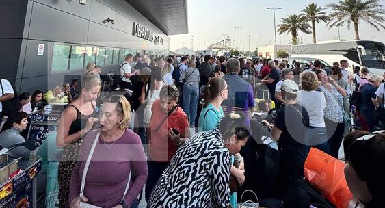 Пассажиры стоят на улице с тележками багажа из-за отмены всех рейсов.Известия