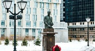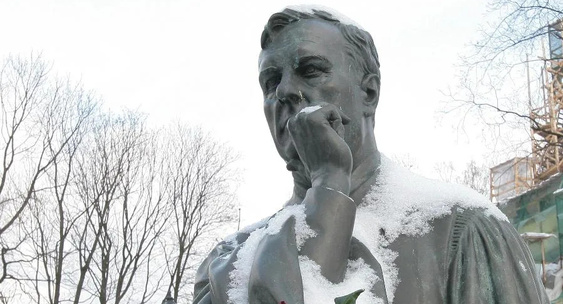 Вокруг бюста Анатолия Собчака, прямо на кафедре, лежит шесть букетов роз разных цветов — белые, красные, розовые.Московский Комсомолец Питер