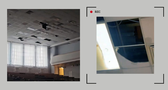 Некоторые панели потолка отвалились, вода капает на пол и ряды парт.ТАСС