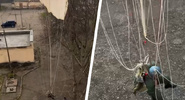 Во дворе дома развернули настоящую спасательную операцию. Сразу несколько мужчин пытались помочь застрявшему парашютисту выбраться из ловушки. Из-за этого им даже пришлось спилить дерево.