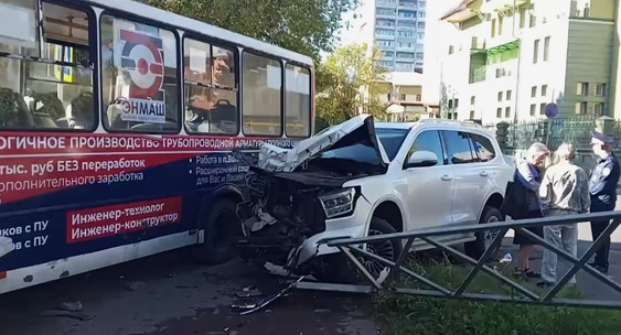 Авария произошла в Рыбинске, где столкнулись автомобиль TANK и автобус.RT на русском