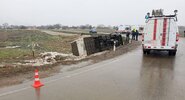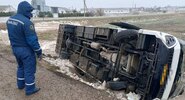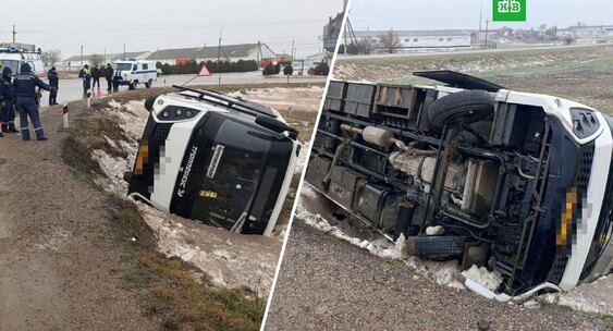 Автобус с пассажирами съехал в кювет и опрокинулся на автодороге в Черноморском районе Крыма, два человека пострадали.RT на русском