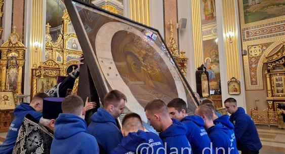 Понадобилось полтора десятка крепких молодых мужчин, чтобы занести образ в Спасо-Преображенский собор столицы ДНР.НИА-Красноярск