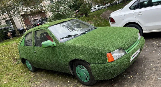 Вся поверхность кузова, включая капот, крышу, двери и багажник, полностью оклеена искусственным ковровым покрытием зеленого цвета, имитирующим густую траву.110KM