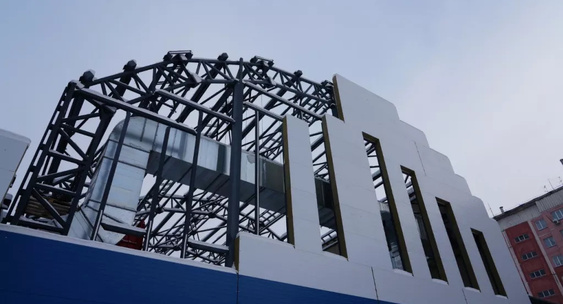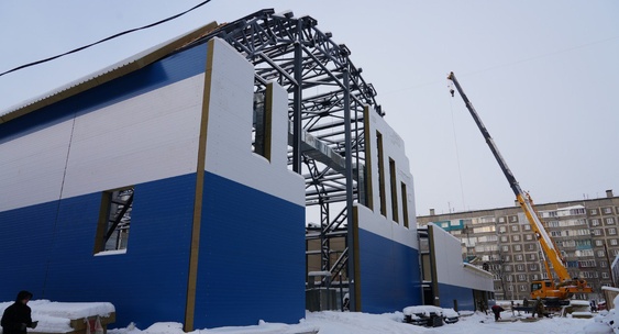 Мэр уточнил, что сейчас полностью собран каркас, на 90% смонтированы внутренние и наружные стеновые панели, крыша (панели покрытия кровли) готова на 50%.Бийский рабочий