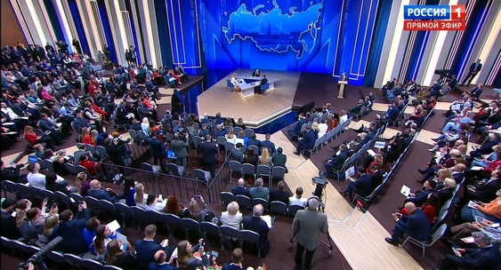 Большая пресс-конференция президента РФ Владимира Путина, совмещенная с прямой линией, началась в Гостином дворе в Москве 19 декабря.Известия