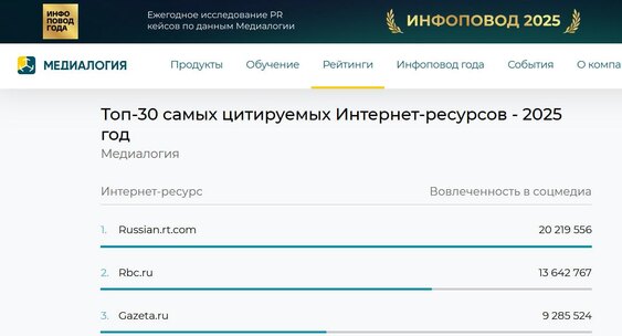 Интернет-издание «Фонтанка.ру» вошло в топ-30 самых цитируемых Интернет-ресурсов по итогам 2025 год, заняв 17-е место по индексу цитируемости и четвертое место по вовлеченности в соцмедиа.Фонтанка.Ру