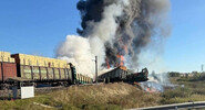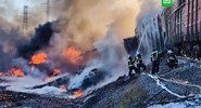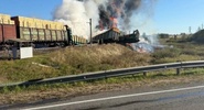 В результате ДТП с рельсов сошли локомотив и 18 цистерн с бензином, после чего начался масштабный пожар.NEWS.ru