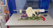 На столе внутри магазина люди оставили детского плюшевого медведя и две розы.ТАСС