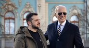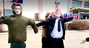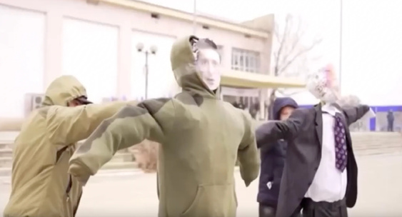 Кукла президента США была облачена в классический костюм, а украинского лидера - в зеленые одеяния.ТАСС