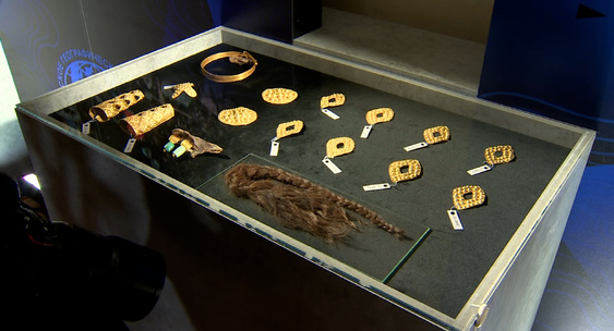 Среди самых важных — бронзовые кинжалы, золотые бусы, накосницы, серьги с бирюзой, бронзовые бляшки с козликом и с пантерой, символом власти.RuNews