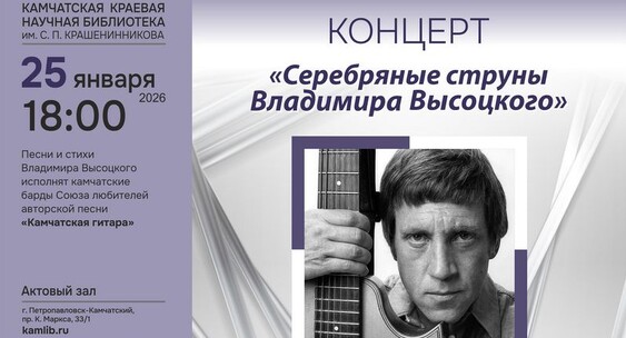 25 января в 18:00 в Камчатской краевой библиотеке им. С.П. Крашенинникова состоится концерт «Серебряные струны Владимира Высоцкого», сообщает портал «Камчатка Сегодня».ИА Камчатка