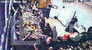 На кадре видно, как более 40 заключенных сидят за столами, уставленными разнообразными блюдами, такими как шашлык, пицца, салаты, выпечка и напитки.Общественная служба новостей