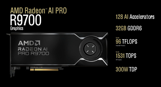 В основе Radeon AI Pro R9700 лежит графический чип Navi 48 с 64 вычислительными блоками (4096 потоковых процессоров), 128 тензорными (ИИ) ядрами, 64 ядрами для трассировки лучей и 256 текстурными блоками.3DNews