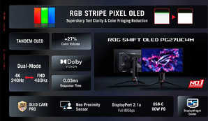ROG Swift PG27UCWM отличается 27-дюймовой WOLED-панелью 4-го поколения с разрешением 4K UHD, частотой обновления 240 Гц, режимом с разрешением Full HD и кадровой частотой 480 Гц, а также отсутствуем плёнки BlackShield Film.Megaobzor.com