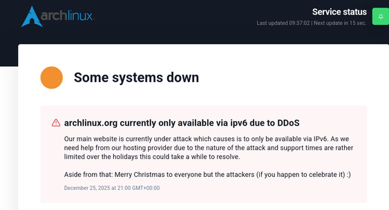 25 декабря 2025 года archlinux[.]org подвергся DDoS-атаке и на данный момент доступен только по IPv6.Anti-Malware.ru