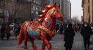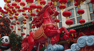 На главной пешеходной улице города - Ванфуцзин - растянуты красочные баннеры с праздничными пожеланиями, многочисленные магазинчики продают сувениры для гостей столицы, а в начале улицы установлена скульптурная композиция из скачущих разноцветных лошадей.РИА Новости