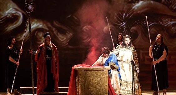 Зато в спектакле есть роскошный цифровой "экшен". Доминирующий образ - гигантская каменная маска Нептуна с бородой, в которой без устали кишат змеи, и с пустыми глазницами, испускающими то слепящий свет, то удушающий дым. Эта маска отсылает к постановке "Идоменея" Жан-Пьера Поннеля начала 80-х годов, где на сцене Metropolitan Opera титульную партию пел Лучано Паваротти...