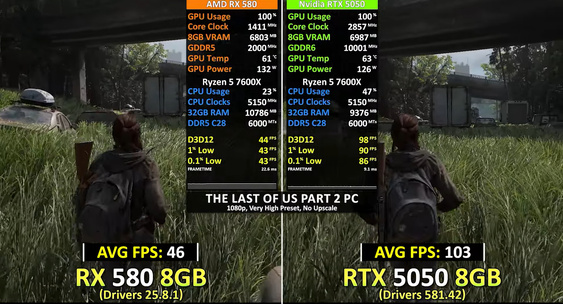 Вывод В целом новая RTX 5050 обгоняла RX 580 на 139% в среднем (103 к/с и 43 к/с соответственно).Ferra