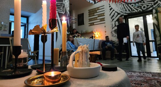 Фото: REGIONS/Иван Петрушин Чтобы передать дух праздника, в зале зажгли свечи, развесили гирлянды, а зрителей угощали горячим чаем.Regions.ru
