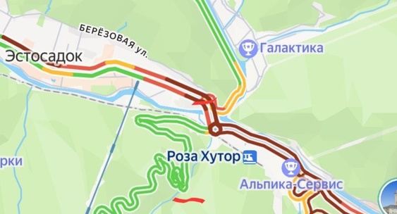 Согласно сведениям приложения "Яндекс-карты", между тремя горнолыжными курортами Сочи вечером в пятницу образовался четырехкилометровый затор.РИА Новости
