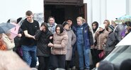 Люди с цветами и игрушками заполнили храм, а многим пришлось стоять на лестницах и рядом с церковью.Life.ru
