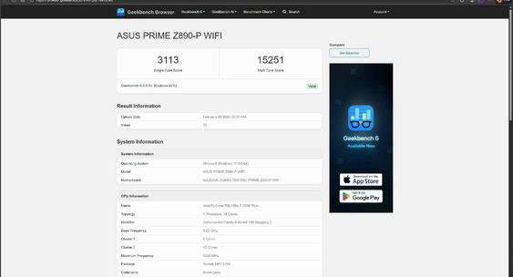 Скриншот Geekbench В ходе тестирования на материнской плате Asus PRIME Z890-P процессор набрал 3113 баллов в однопоточном тесте и 15 251 балл в многопоточном.iXBT.com