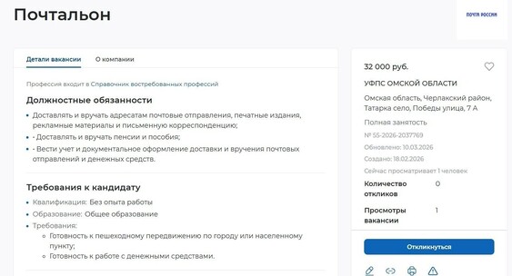 На сайте «Работа России» в вакансиях для почтальонов указана зарплата до 32 тысяч рублей.Город55.ру