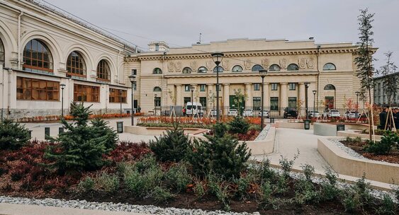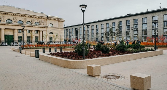 Центральным элементом пространства стал памятный знак, посвящённый истории железнодорожного сообщения в России.Форпост Северо-Запад