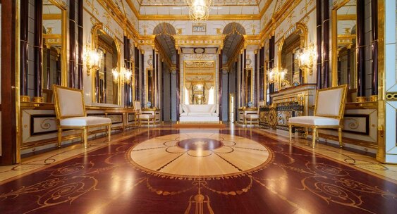 В течение пяти лет более 200 реставраторов — лепщиков, позолотчиков, резчиков по дереву — трудились над восстановлением восьми интерьеров.Piter.tv