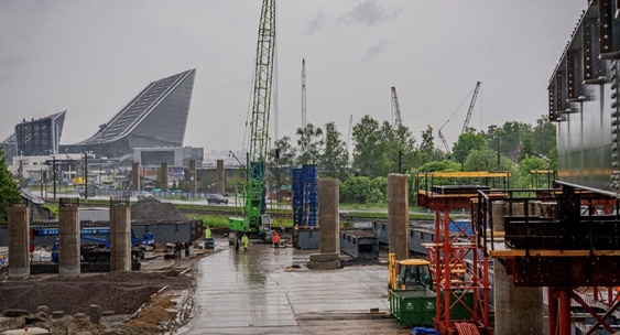Сейчас на площадке возводят ключевой элемент новой транспортной сети – двухуровневую путепроводную развязку с Приморским шоссе возле "Лахта Центра".Smotrim.ru