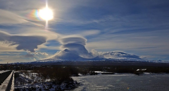 Как объясняют специалисты, линзовидные облака формируются при волновых колебаниях воздушных масс: когда ветер сталкивается с горным хребтом или вулканом, поток поднимается вверх, охлаждается и образует облако над вершиной.Кам 24