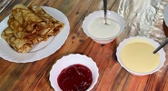 Ассортимент блинов был представлен различными начинками, в том числе творог, мясо, повидло, сгущенное молоко и сметана.РИА Новости