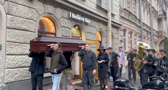 В украшенном гробом баре провожали маленькие бары, которые не смогут продавать алкоголь с 1 сентября.DP.RU