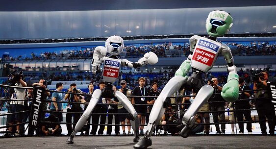 Поединок по кикбоксингу между роботами / © Lintao Zhang / Getty Images На одном из мероприятий Всемирных игр гуманоидных роботов состоялся один из первых в истории поединков по кикбоксингу между роботами.Naked Science