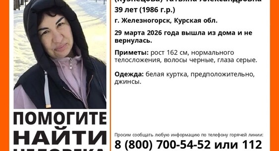Поисковый отряд «ЛизаАлерт» объявил о розыске 39-летней Татьяны Лиры (второй фамилии – Кузнецовой), пропавшей в городе Железногорске. Женщина ушла из дома 29 марта, и с тех пор о её местонахождении ничего не известно.