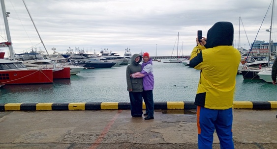"Было, только летом", - признаются гости, предпочитая фотографироваться на фоне моря с яхтами и птицами, а также здания морпорта с фирменным шпилем.Российская газета