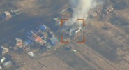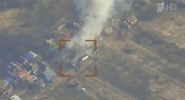 С воздуха показаны удары по укреплениям среди деревьев - после попаданий возникают крупные очаги огня. На других кадрах видно задымление в застройке - удары наносятся по объектам, расположенным вблизи домов и хозяйственных построек.