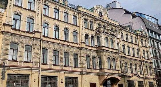 Цоколь здания облицован известняком и серым с прожилками мрамором, лицевой фасад оштукатурен, рустован с использованием чередования гладкой и фактурной штукатурки.Neva.Today