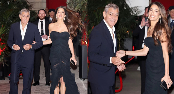 Амаль, 47-летняя супруга актера, юрист по образованию, выбрала черное платье без бретелей с разрезом-серебрянкой, подчеркивающее стройные ноги.WomanHit.ru