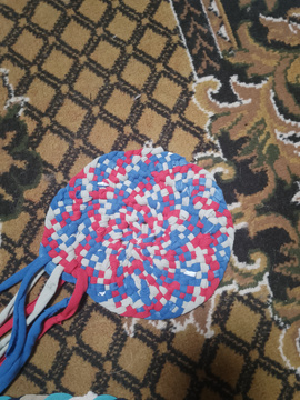 Не быстро продвигается работа, Но ведь идет же. Понемногу в день удается плести свой коврик. После очередного пестрого кольца- красное, снова из четырёх драночек. А следующий приплет вновь пестрый- четыре черных, и по две светлых с разными орнаментами. Легко плетется, хоть и не быстро. А после пестрого кольца в планах было вновь монохромное пустить, есть у меня малиновые дранки. Но, не поверите, увлеклась и закрепила опять пестрые...